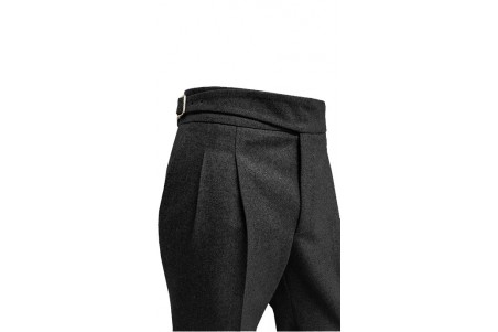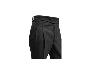 Podwójne zakładki, wysoki stan, unikalny i charakterystyczny pas Gurkha z zapięciem na dwie boczne klamry.